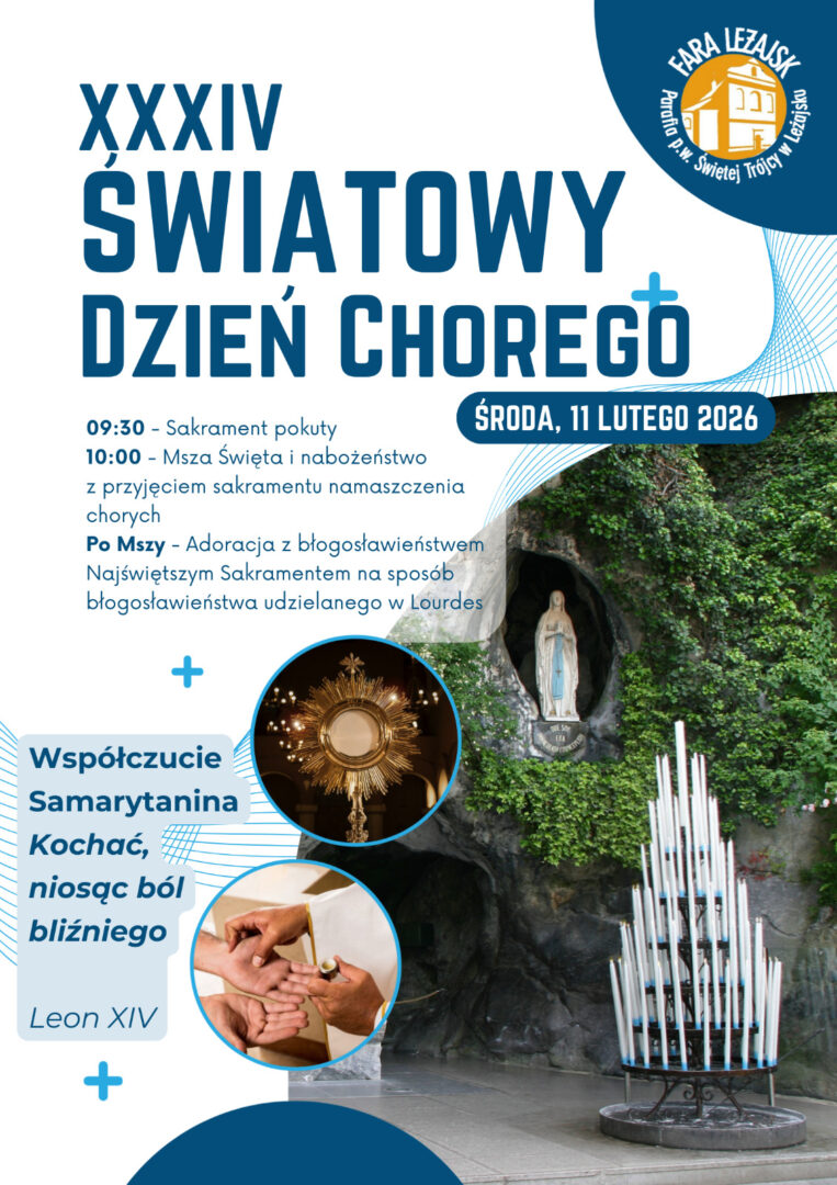 - W środę, 11 lutego, w dzień liturgicznego wspomnienia Matki Bożej z Lourdes, będziemy obchodzić Światowy Dzień Chorego. Z tej okazji, zapraszamy wszystkie osoby starsze i chore na specjalną Mszę św. i nabożeństwo o godz. 10.00 w czasie, którego będzie można przyjąć sakrament namaszczenia chorych. Modlitewne spotkanie zakończy się adoracją z błogosławieństwem Najświętszym Sakramentem na sposób błogosławieństwa udzielanego w Lourdes. Przypominamy i uwrażliwiamy, iż sakrament namaszczenia może przyjąć osoba chora bądź starsza, będąca w stanie łaski uświęcającej i po spowiedzi. Dlatego też, przed Mszą św. od godz. 9.30 będzie możliwość skorzystania z sakramentu pokuty.