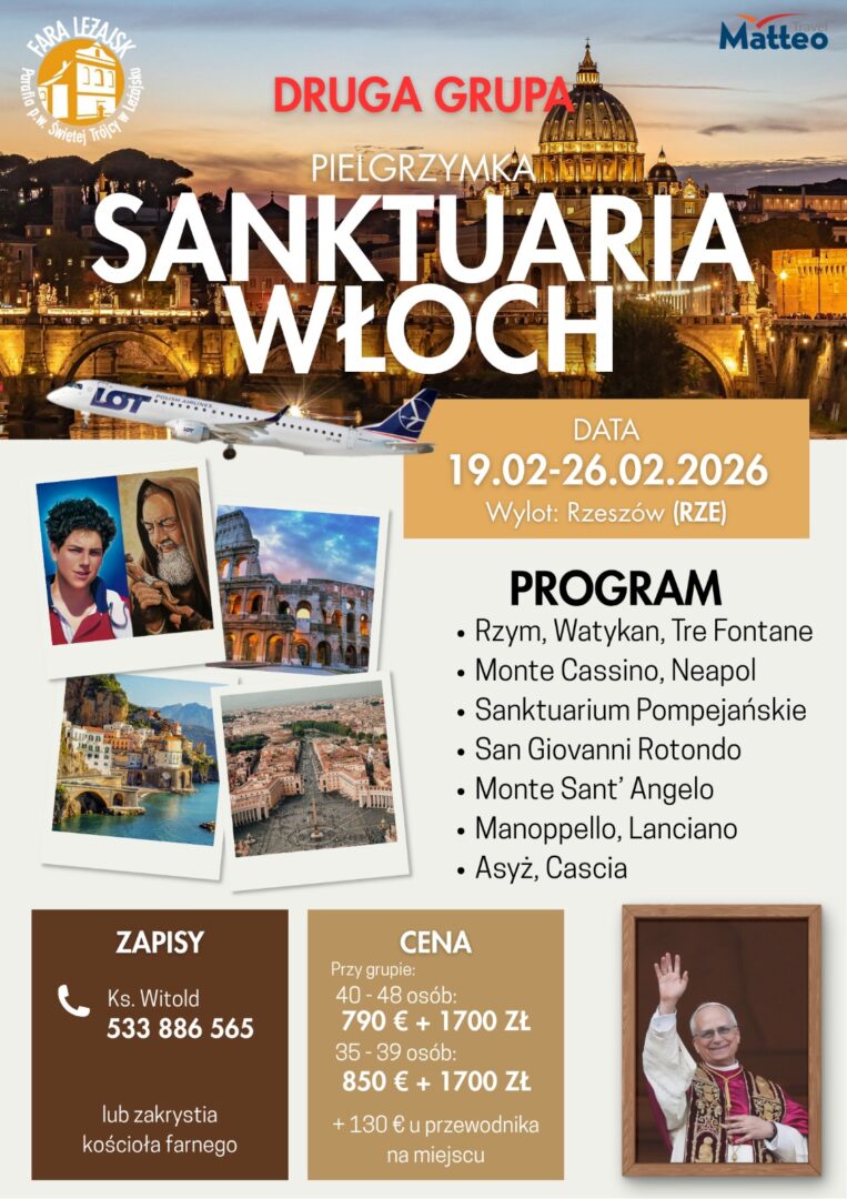 - Także w sobotę 6 września zapraszamy na dziękczynną autokarową pielgrzymkę do relikwii bł. Rodziny Ulmów w Markowej. Mamy zamówione dwa autokary i jest jeszcze sporo miejsc. Jest to równocześnie kościół Jubileuszowy a więc będziemy też pielgrzymować z intencją zyskania odpustu. Serdecznie zapraszamy, szczegóły na tablicy ogłoszeń a zapisy w zakrystii.